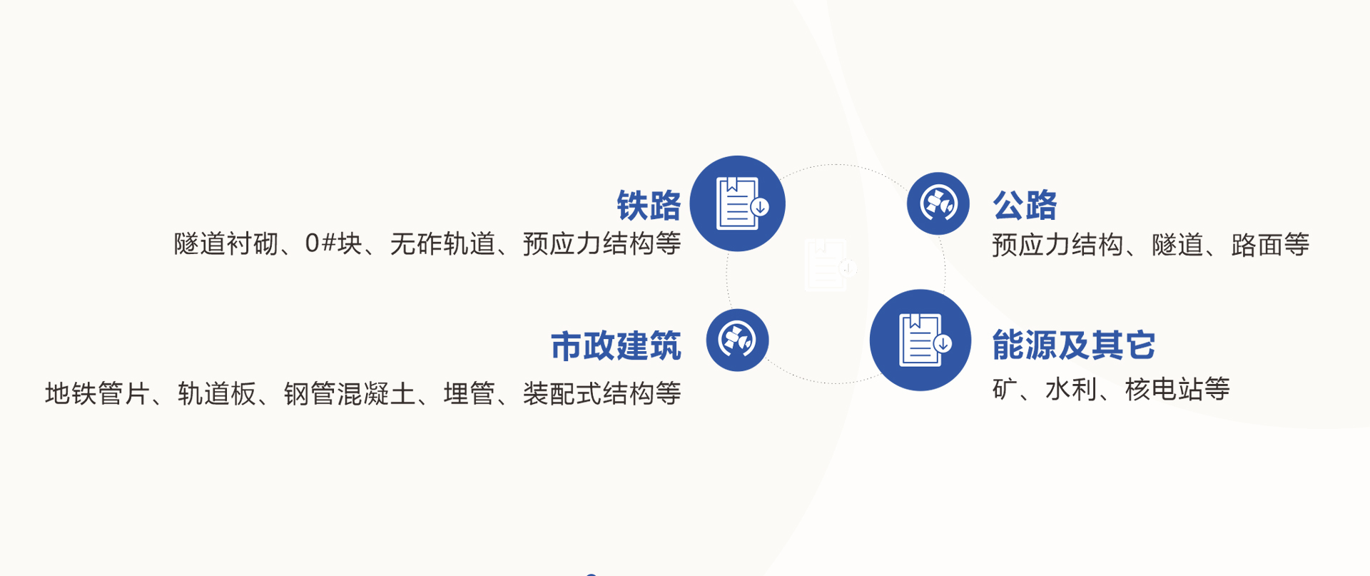 铁路:隧道衬砌、0#块、无砟轨道、预应力结构等 市政建筑:地铁管片、轨道板、钢管混凝土、埋管、装配式结构等 公路:预应力结构、隧道、路面等 能源及其它:矿业、水利、核电站等