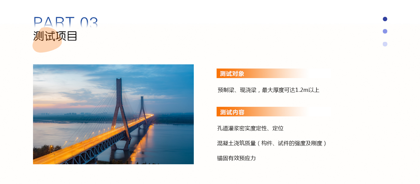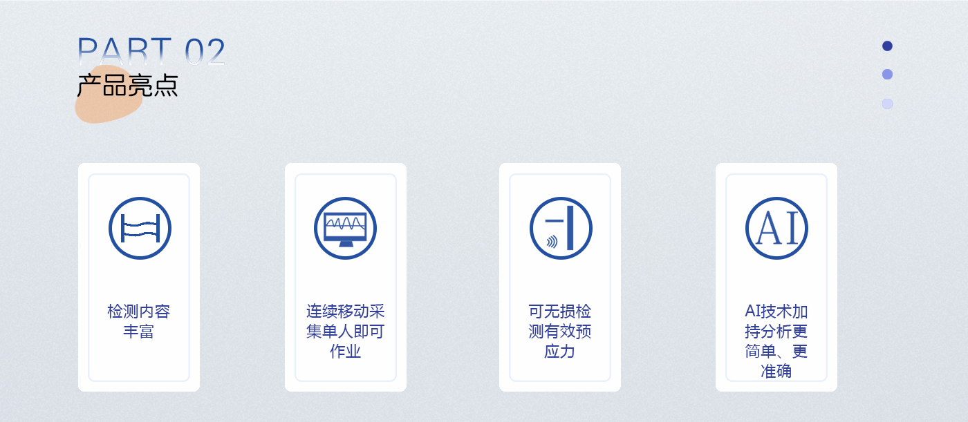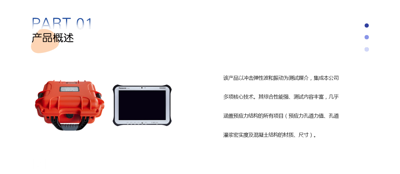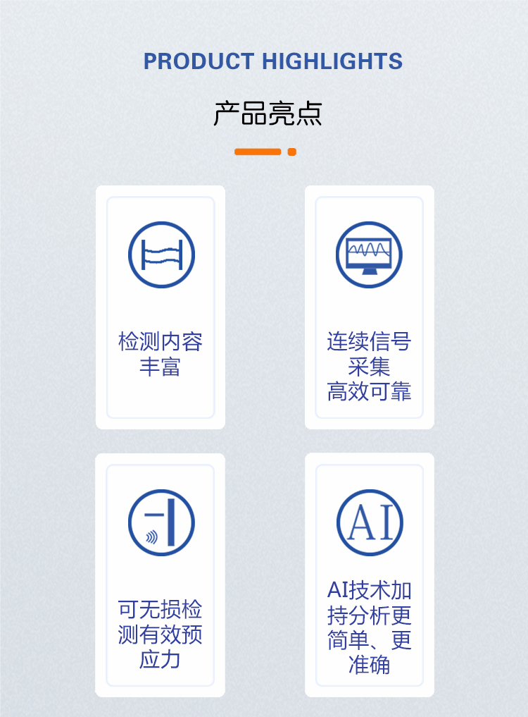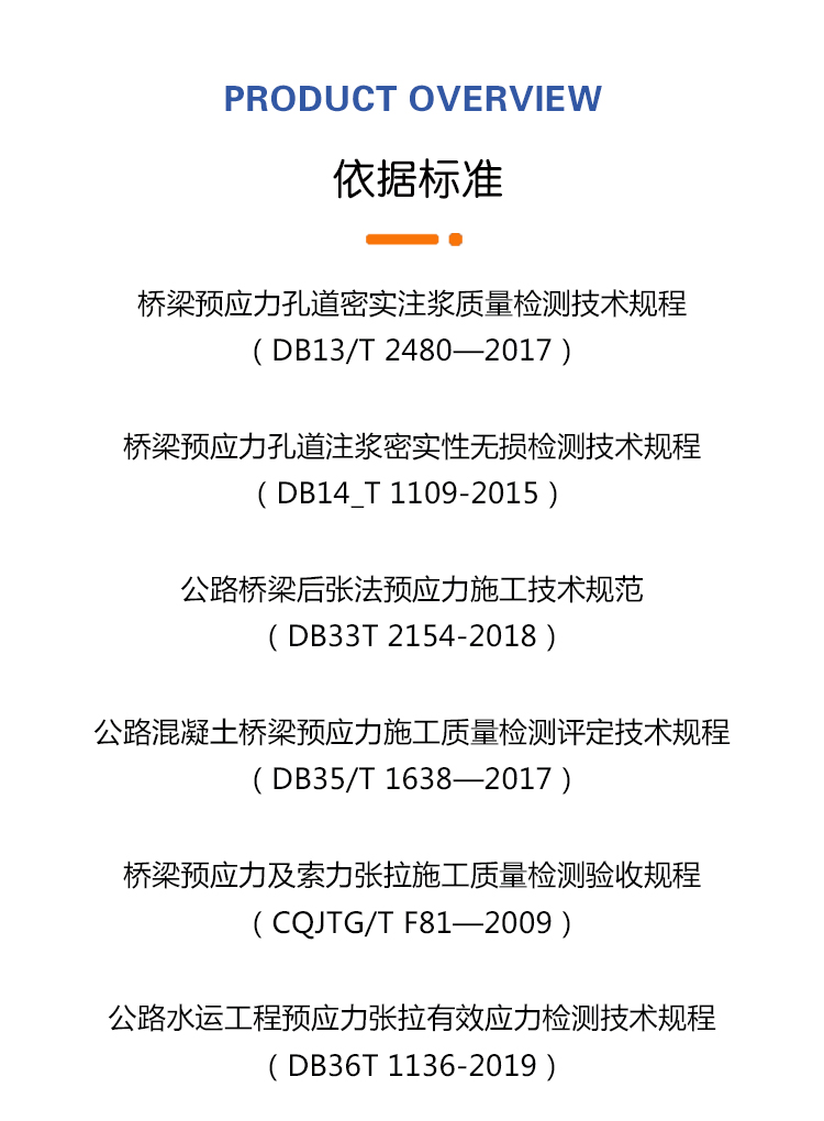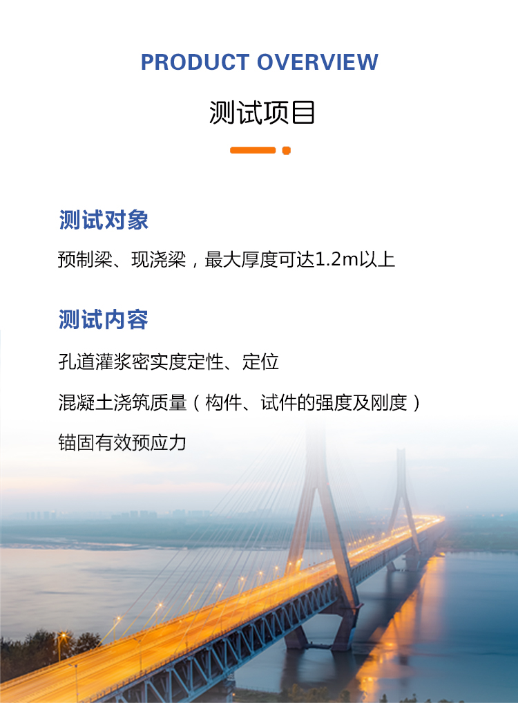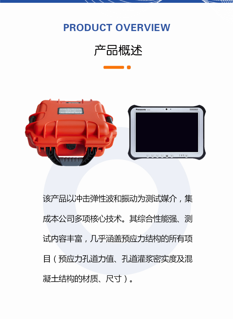 | 1 | 功能:仪器可对预应力孔道灌浆质量(快速定性、精确定位);锚下有效预应力;悬索张力;混凝土材质及尺寸进行快速无损检测。并可生成检测报告,提供云端数据库管理服务 |
